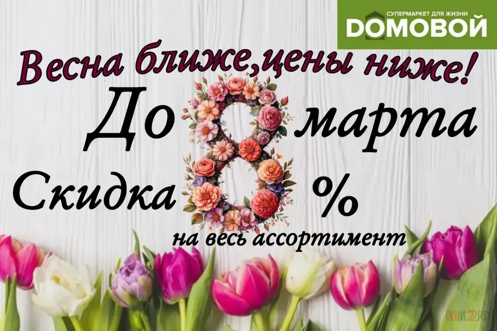 У нас отличная новость! С 1 по 8 марта в супермаркете «Домовой» действует скидка 8% на весь ассортимент товаров. 🎉 🛒