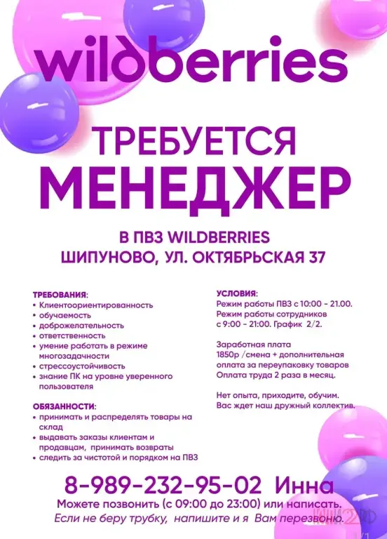 ТРЕБУЕТСЯ МЕНЕДЖЕР В ПВЗ WILDBERRIES ШИПУНОВО, УЛ. ОКТЯБРЬСКАЯ 37 📍